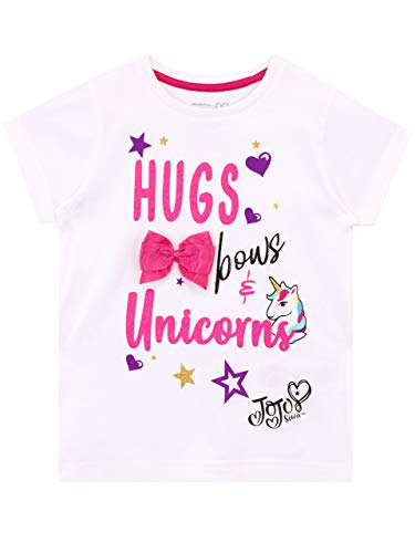 Details: Girls JoJo Siwa T-Shirt. Siwanatorz far and wide will stand out from the crowd in this awesome JoJo Siwa tee! In brilliant white, the front of the top features the slogan 'Hugs Bows & Unicorns' - 3 must-haves for any fan of JoJo! 'Hugs' and 'Unicorns' is printed in bright pink glitter and also features a 3D pink bow as well as accents in purple glitter and a cute unicorn print. A perfect top to pair with one of JoJos signature bows!