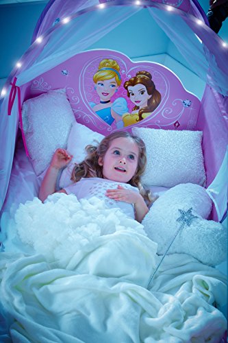Details: Product Description Make the transition from cot to Big kids' bed magical with her very own Disney princess toddler bed including beautiful bed canopy with magical twinkling lights. Join Belle, Cinderella, Rapunzel, Ariel and sleeping beauty under a pretty bed canopy as they take her on a magical adventure to the land of sleep. This Pink toddler bed comes complete with Pink canopy and twinkling lights, so her imagination can run free as she curls up and drifts off. The perfect height for toddlers' little legs to hop up and hunker down, the delightful Disney princess carriage toddler bed is practical too; with protective side panels to stop bedtime tumbles, a sturdy bed frame to keep her safe and snug and easy build instructions and parts. Part of the Disney princess kids' bedroom and furniture range by HelloHome. Takes a cot bed sized mattress - 140 cm (L) x 70 cm (W). mattress not included. Suitable for 18 months to 5 years. Box Contains 1 x bed plus fittings 1 x instructions