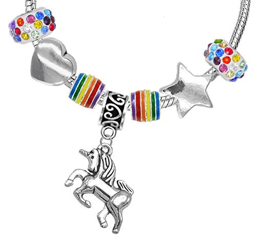 - Set Includes: 2 x Sparkly Multi-Coloured Rhinestone Beads, 2 x Rainbow Enamel Spacer Charms, 1 x Silver Plated Heart Charm, 1 x Silver Plated Star Charm, 1 x Unicorn Pendant Charm, 1 x 16cm Silver Charm Bracelet, 1 x Gift Box