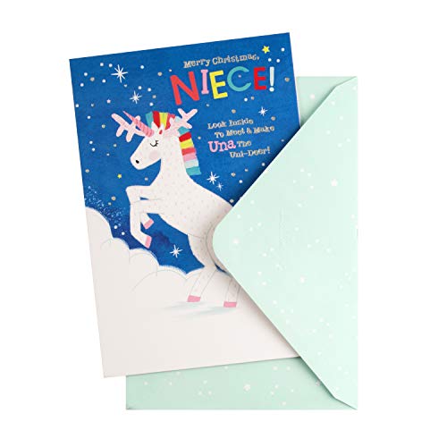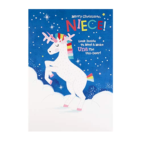 Details: Add a little extra magic to your niece's Christmas with this super-cute, finger puppet based, activity card from Hallmark. Featuring a cute and colourful illustration of the unit-deer herself, silver foil lettering and design details, enclosed pop-out puppet elements and assembly instructions, and a simple festive wish, this fun card is a great way to make a special Niece smile.