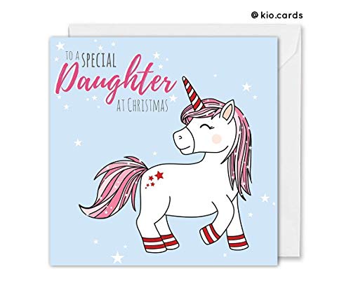 Details: ☆ Glitter Unicorn Christmas Card For Daughter ☆ If your Daughter loves unicorns, then she'll love this unicorn Christmas card! This delightfully cute unicorn drawing is hand finished with glitter for a little Christmas sparkle! Added onto her pretty pink hair, festive candy cane striped horn and hooves and also onto the loving greeting of "To a Special Daughter at Christmas". ☆ Unique hand drawn digital illustration ☆ High quality print on 350gsm FSC-certifired card ☆ Hand embellished with glitter ☆ Square when folded - measures 148x148mm" ☆ Left blank inside for you to add your own Christmas greetings ☆ A white envelope is included 2019 KIO CARDS All images, artwork and content. All rights reserved. Say hello on Instagram: @kio.cards