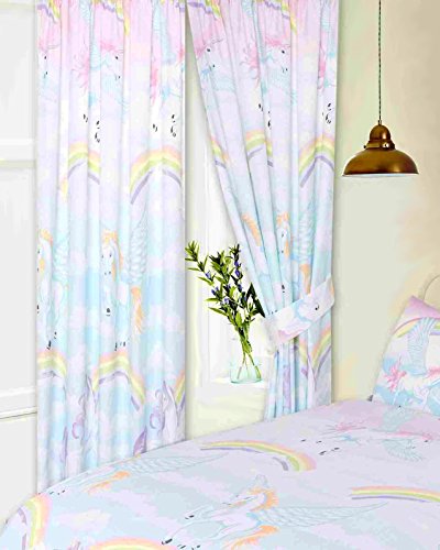 These pencil pleat unicorn rainbow curtains are a great idea for a unicorn themed bedroom. They will bring fun, colour and beauty to the room and can be matched with the matching duvet set which is also available to buy online. A lovely design features a blue background with a plush white unicorn, clouds and rainbows.