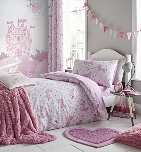 The Catherine Lansfield unicorn range of interiors is truly stunning, and these unicorn themed curtains are some of the most beautiful ones available to buy online in the UK. These curtains have a pink and white colour theme, with a plush unicorn print and a pretty floral decoration throughout. Made from a mixture of cotton and Polyester these curtains are easy to keep clean and can be put through the washing on a cotton cycle. They can also be tumble dried and easily ironed to remove any creases.