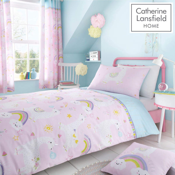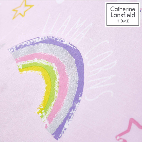- An illustrative design on a pretty pink background featuring a smattering of glitter and an adorable llama-corn Fitted with an easy to hang eyelet header and fully lined to ensure a restful night's sleep