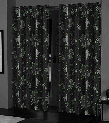Details: Thermal Glow In The Dark 75% Blackout Ready Made Curtain Pair Ring Top Light Reducing Eyelet Curtains DURABLE FAUX SILK POLYESTER PLAIN CURTAIN WITH BEAUTIFUL DRAPE AND THERMAL INTERWOVEN LINNING BLOCK OUT THE UNWANTED LIGHT AND REDUCE HEAT LOSS BY INSULATING THE ROOM MACHINE WASHABLE 100% POLYESTER PLEASE NOTE THAT THESE ACTUALLY GLOW IN DARK AND ALSO IN DAY IF LIGHT FALLS DIRECTLY ON THE STARS AND UNICORNS. WASH WITH SIMILAR COLOURS - WASH DARK COLOURS SEPARATELY (FOLLOW WASH CARE INSTRUCTION
