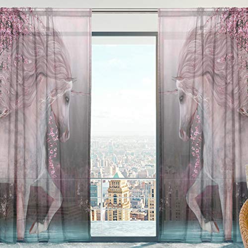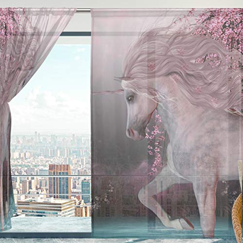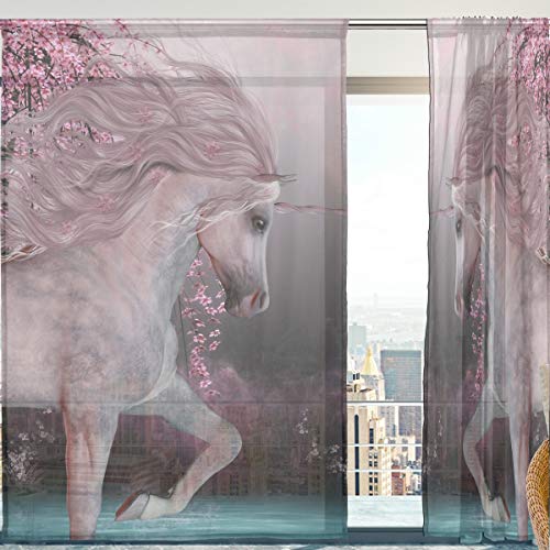 Cherry Blossom Unicorn Sheer Voile Curtains, Soft Sheer Curtains for Bedroom Living Room 140 x 198 cm 2 Panels