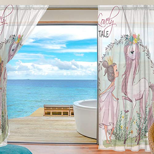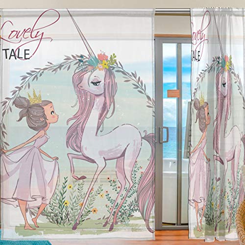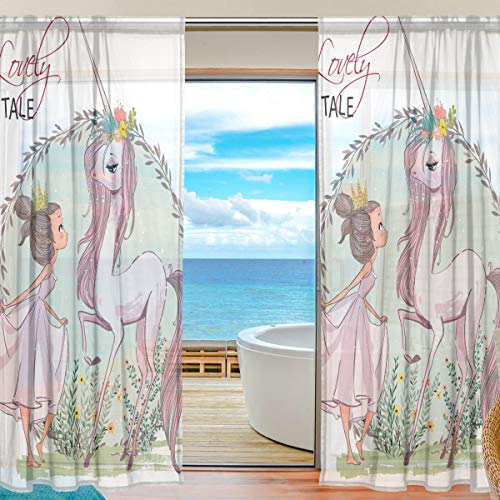 Unicorn With Girl- Home Decoration Sheer Voile Curtains Kids Room 55 x 78 Inch, Voile Curtains 2 Panels