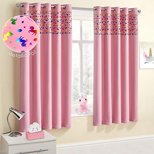 Velosso Blackout Blush Pink Unicorn Multi Coloured Foil Printed Super Soft Thermal Insulated Blackout Ring Top Eyelet Pair of Bedroom Curtains (66" Wide x 54" Drop)