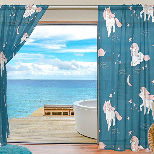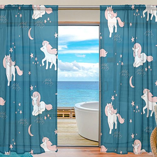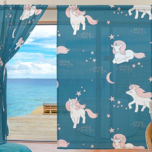 Teal Cute Unicorns And Stars Window Sheer Curtains - Modern Voile Panels Tulle Curtains 78 Inches Long For Living Room Bedroom Set of 2