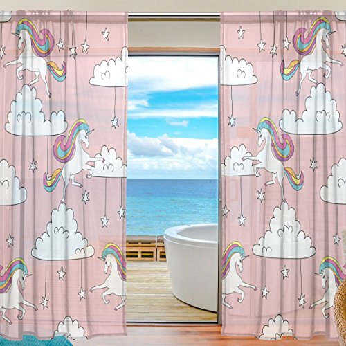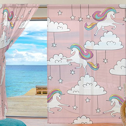 Unicorns Clouds Stars Pink Window Sheer Curtains Panels Voile Drapes 84 Inches Long For Living Room Bedroom Girl's Room 2 Panels
