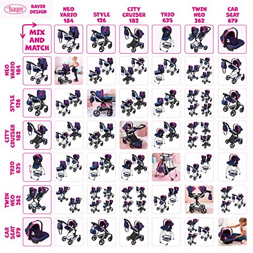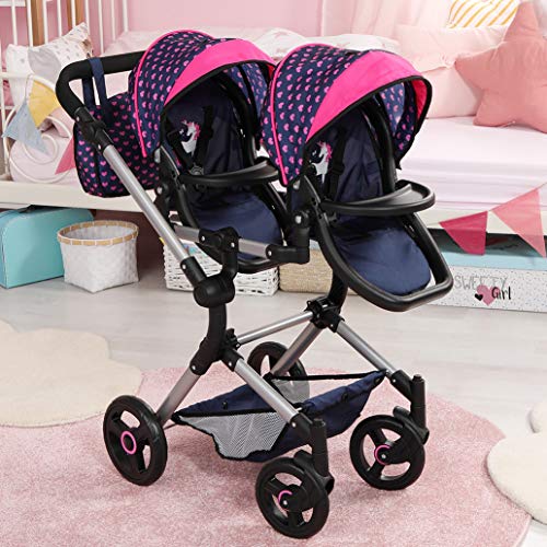 - ✔ The new twin doll pram from Bayer Design in a beautiful modern look convinces as usual with high quality, powerful colours and beautiful design (unicorn with hearts) Convince yourself of our brand new twin doll pram it is the perfect pram for functional dolls, talking dolls, newborn dolls or plush toys up to a size of 46 cm