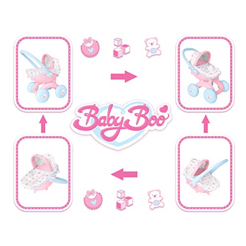 - GREAT FEATURES - The BabyBoo Micro Pram is ideal for your little one. It has an easy release cradle, as well as adjustable handles and wheels. The BabyBoo 4 in 1 my first pram converts between pram, forward facing pushchair, carry cot and baby seat. This beautiful pram comes in pretty pink with coordinating fabric bedding with a striped hood.