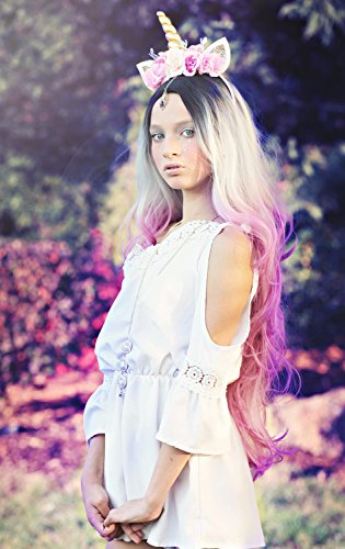 Unicorn Flower Headband Crown For Fancy Dress Up Unicorn Birthday Party (Pink and Gold)