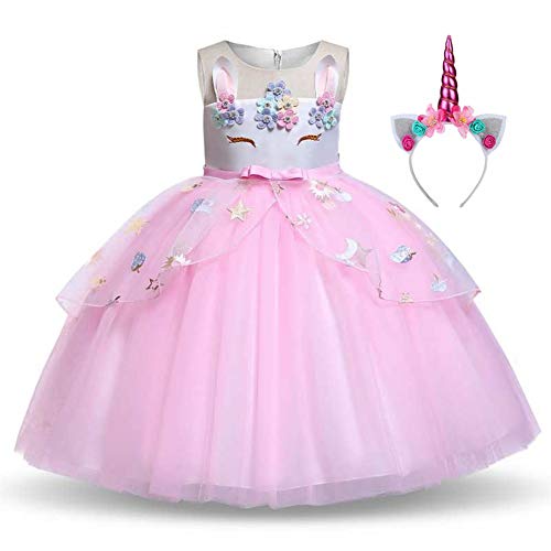 Pretty Princess Girls Unicorn Party Dress Princess Dressing up Costume with Headband, 4-5 Years, Pink