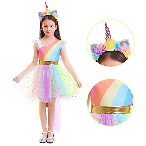 - ★★ Features: Girls super chic and lovely unicorn rainbow dress shiny sequins flying ruffle mesh sleeves bodice, printed with colorful irregular stripes, one straps shoulder top with golden waistband, making it a lovely unicorn princess dress for realizing little girl's princess dream;