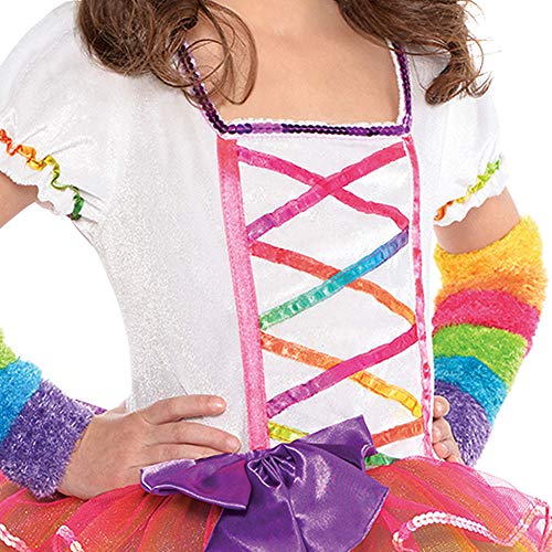 Details: Our Rainbow Unicorn Costume for girls features a colourful dress with lattice rainbow ribbon on the white velour top. A purple bow sits at the waist above the layered rainbow-coloured tutu skirt with an attached tail in back. Coordinating fuzzy rainbow arm and leg warmers and a unicorn horn and ears headband with mane complete your fantastical ensemble! Please note: Stockings/Tights are NOT included Sizes subject to availability:- Small Age: 3 -4 Years Chest: 58cm Waist: 53cm Shoulder to hem: 43cm Medium Age: 4-6 Years Chest: 63cm Waist: 58cm Shoulder to hem: 55cm Medium/Large Age: 6-8 Years Chest: 67cm Waist: 58cm Shoulder to hem: 59cm Large Age: 8 -10 Years Chest: 71cm Waist: 62.5cm Shoulder to hem: 64cm Extra Large Age: 10-12 Years Chest: 76cm Waist: 64.5cm Shoulder to hem: 70cm XXL/Teen Age: 12-14 Years Chest: 83cm Waist: 68cm Shoulder to hem: 72cm All Sizes are Approximate