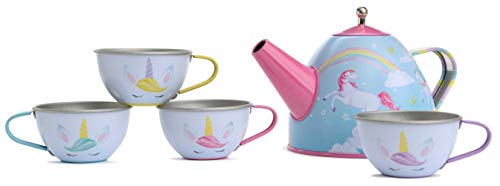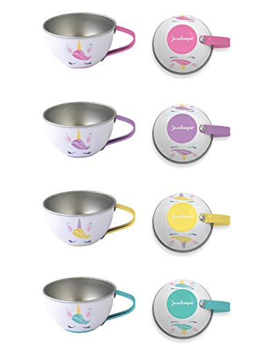 - TEA TIME PLAY: This adorable Jewelkeeper toy tin tea set is designed for pretend play, encouraging little children to use their imagination and improve their creativity and social skills. The tea set is decorated with magical unicorns, enchanted castles, and beautiful rainbows.