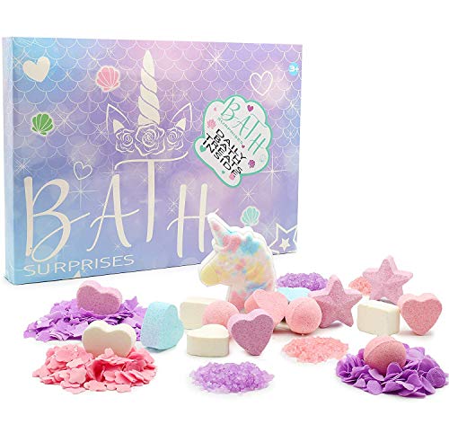- 🦄 24 PIECES UNICORN GIFT SET: includes 1 x large unicorn shaped bath bomb, 7 x 30g multi-colour bath bombs in stars, squares and ball shapes, 8 x 25g bath bombs heart shapes, 4 x 15g scented soap confetti bags, 4 x 15g scented bath salt bags. Select one or more product each day and turn bath time into a new scented water adventure. Assorted pastel colours