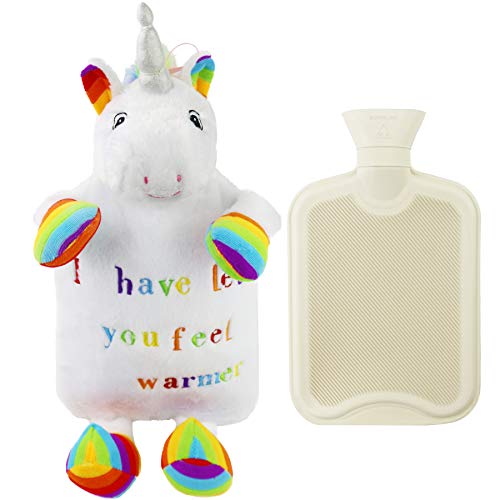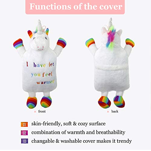 - 1. CUTE RUBBER HOT WATER BOTTLE--- Compared with the traditional hot water bottle, our hot water bottle has a cute plush unicorn cover. The lovely unicorn opens its arms as if it is waiting for your hug. The soft plush surface of the hot water bottle gives you a warm and comfortable feeling. Our hot water bottle not only can keep us warm but also can win the favour of broad consumers because of its lovely and fashionable appearance.