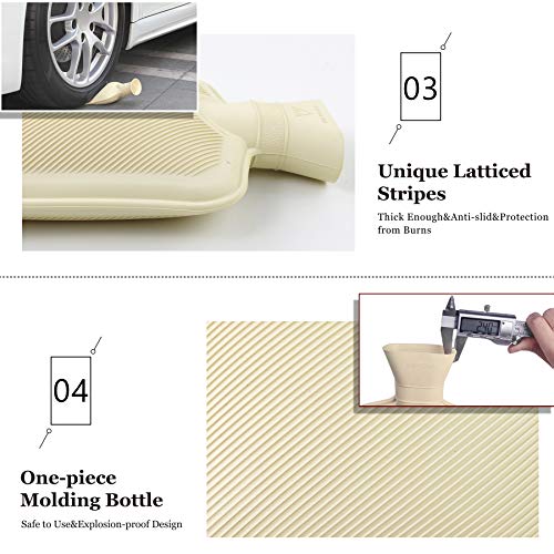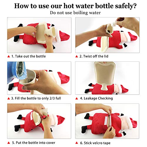 - 2. EASY TO USE--- Wide mouth makes it easy to fill and helps prevent water from splashing back out like the traditional rubber hot water bottles. Don't fill the hot water bottle with too much water, just fill it with 2/3 of the capacity of the it, then smooth out the extra air from the bottle and tighten the cap and wipe dry the bottle. Finally, take the bottle upside down for leakage checking.