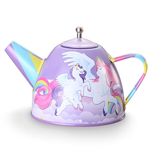 - REAL FUNCTION. This adorable toy tin set is designed for pretend play, encouraging children to use their imagination and improve their creativity and social skills. The tea set is decorated with a magical unicorn , rainbow, and other delightful castle. Sure to delight and inspire your little unicorns.