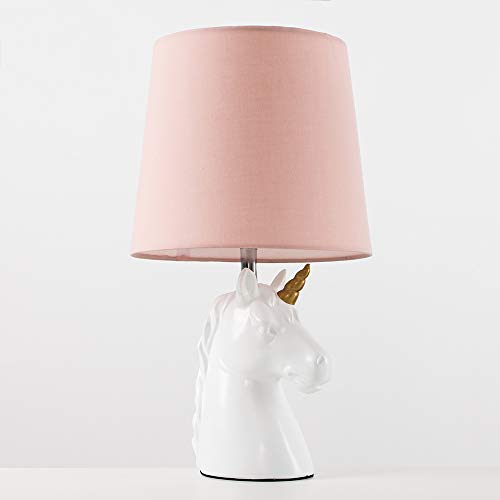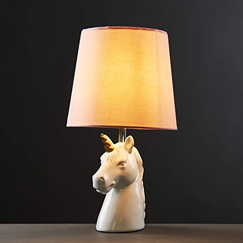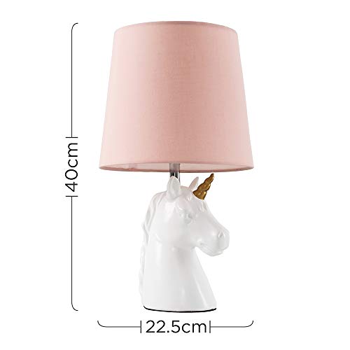 Details: Modern unicorn table lamp in a gloss white and gold ceramic finish. Complete with a beautiful complimenting pink polycotton tapered light shade. This unique lamp will look great in any interior space. Its quirky design is a great alternative to a traditional table lamp. Modern unicorn table lamp in a gloss white and gold ceramic finish. Complete with a beautiful complimenting pink polycotton tapered light shade. This unique lamp will look great in any interior space. Its quirky design is a great alternative to a traditional table lamp. Please note: This is NOT a toy. Not suitable for children under 14 years old.