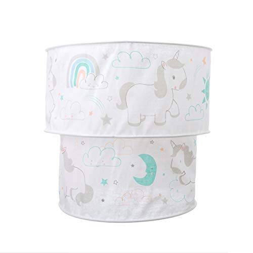 Details: Missing a special something in your little one's room? This dreamy two-tier lampshade is adorned with our loveable Evie Unicorn (who is only found in sweet dreams). Get lost in a world of pastel rainbows, whimsical night skies and an endless stream of gorgeous green pom poms.