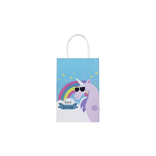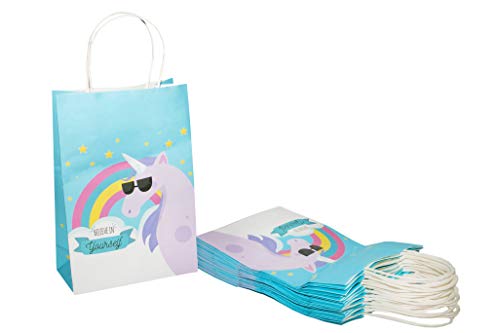 Details: Not only do unicorns exist, but cool unicorns can fly right into any party, all you need to do is buy this set! These bags are and bold with a radical unicorn in shades in front of bright rainbow and really make an impression with their generous size. Little guests also get slogan "believe in yourself" as a constant flow of positive messages are important for their development This set of large bags comes with strong rope handles and a reinforced bottom to allow party guests to easily carry away their party treatsThis enjoyable positive set is:✔️ Handy for all occasions for ✔️ Perfect gift for kids parties, Awkward sized xmas presents ✔️ Made with high quality, recycled thick 120GSM paper What you'll get in this set : ✔️10 Large premium quality party bags ✔️Bright and beautiful custom design not available from any other seller ✔️ 24 x 7 Customer Support ✔️Inspiration positive logo to give to the kids Rest assured💸100% Money Back Guaranteed, no questions asked, if you do not like it return it. If anything has happened to the product in transit or faulty, please email us and give the opportunity to make it up to you. We are a small family startup and your satisfaction is the lifeblood of our company. Discount Be safe in the knowledge that these are not cheap plastic bags which are bad for the environment and present a hazard for young children. What do you have to lose? CLICK ON THE ADD TO CART BUTTON AND BUY NOW!! 👆 Product Specifications: Large size Bags (each bag) -12" x 8" x 4" inches or 30 x 20 x10cm Quantity - 10 PIECE