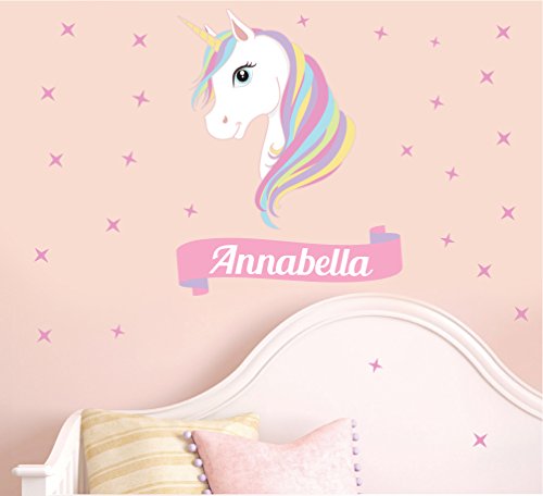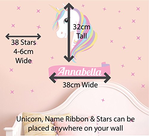 These personalised name Unicorn and Stars vinyl stickers are sure to make a stand out feature in any room. With its cute design featuring a unicorns head with multi-coloured pastel hair, lots of pretty stars and your child's name this would look lovely in any room.