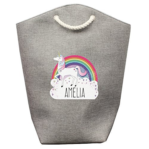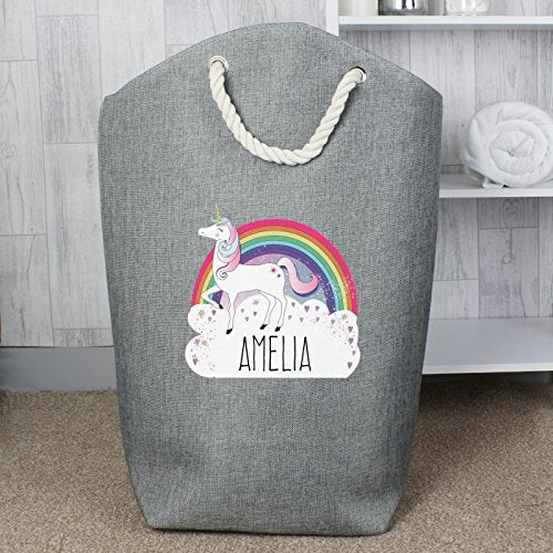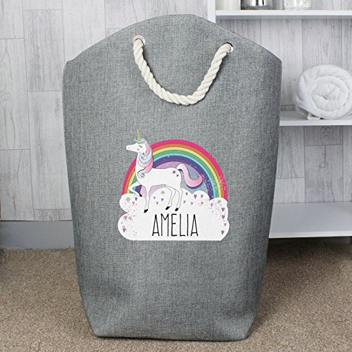 It features a cute unicorn, rainbow and cloud design with your name of choice on the front of the stylish grey bag. It has some practical rope carry handles, is made from a heavy polyester material and has a sturdy base ensuring that the bag will stand up and maintain its shape no matter if it is full or empty. The height of the bag is: 60 cm, the width 52cm and the depth 25cm.