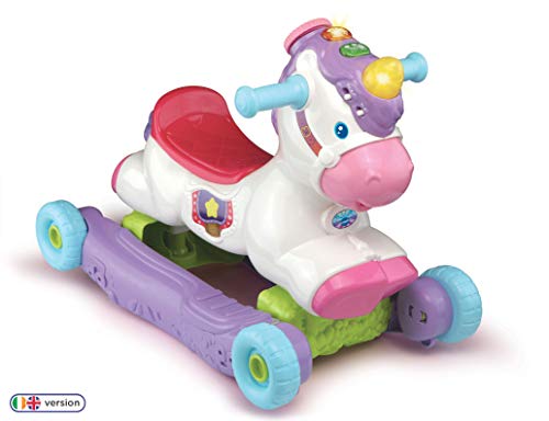 Details: Product Description VTech Rock and Ride Unicorn is a suitable baby toy to support your baby's first steps. This ride on unicorn acts as a baby walker to help develop lower body strength and develop gross motor skills. This interactive learning toy features 2 light up buttons that introduce different colours and the unicorn itself to encourage language development. When the motion sensor is triggered, this baby light up toy plays different sounds, songs and melodies. There's a total of 3 sing-along songs and 15 melodies for your baby to sing along, dance to and enjoy. Safety Warning N/A Box Contains toy