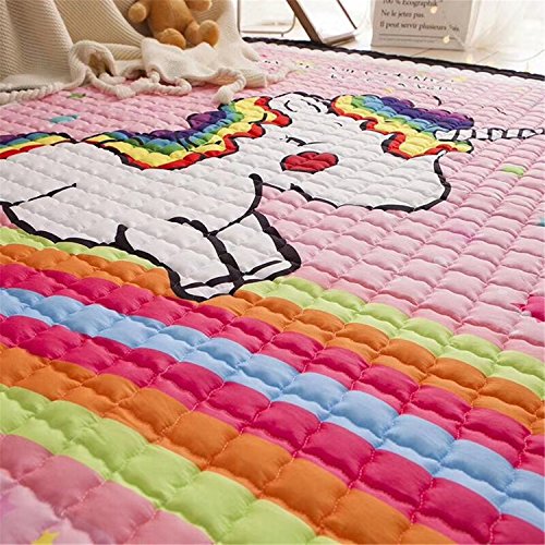 This Pink Rainbow Unicorn Rug measures 195 x 145cm. Lots of vibrant colours makes this a top choice for a child's play room or bedroom. Best suited to a room whereby adding a large splash of colour can act as a centre piece to the bedroom. Nice and soft padding protects little one from hard falls and makes this the perfect mat for play time. It's anti slip latex backing will ensure that the rug doesn't move around a lot when placed on a wooden floor or carpet. This is a unique and durable rug which can be hand cleaned without fear of causing damage to the fabric. Great for unicorn themed nursery and baby rooms.