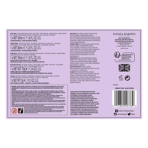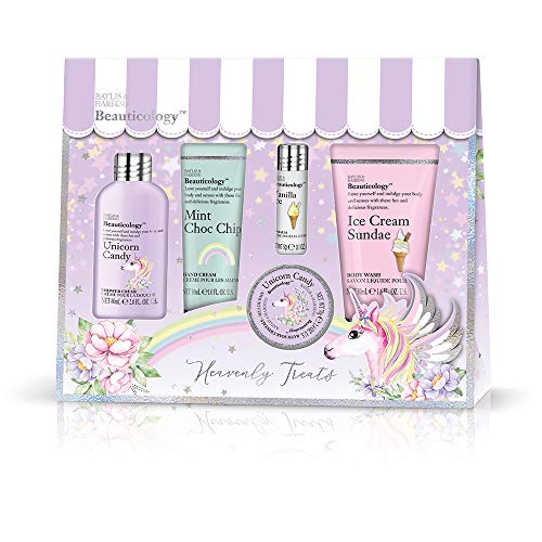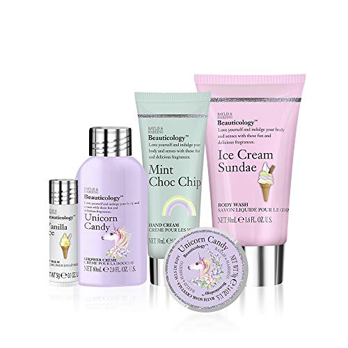 Details: Product Description Beauticology UNICORN holiday pamper set makes the perfect beauty treats set this Christmas. A gorgeous gift containing five beauty treats. Luxurious 70g UNICORN candy bath Soak crystals, 60ml UNICORN candy Shower Crème, 50ml Ice cream sundae body Wash, 30ml mint Choc Chip hand cream and 5g vanilla ice Lip balm. Ingredients Body Wash: Aqua (Water), Sodium Laureth Sulfate, Sodium Chloride, Cocamidopropyl Betaine, PEG-150 Distearate, Parfum (Fragrance), Benzyl Alcohol, Methylchloroisothiazolinone, Methylisothiazolinone, Magnesium Chloride, Magnesium Nitrate, Disodium EDTA, Citric Acid, Benzophenone-4, Shower Crème: Aqua (Water), Sodium Laureth Sulfate, Sodium Chloride, Cocamidopropyl Betaine, Glycol Distearate, Acrylates/C10-30 Alkyl Acrylate Crosspolymer, PEG-150 Distearate, Parfum (Fragrance), Benzyl Alcohol, Methylchloroisothiazolinone, Methylisothiazolinone, Magnesium Chloride, Magnesium Nitrate, Disodium EDTA, Citric Acid, Benzophenone-4, Hand Cream: Aqua (Water), Paraffinum Liquidum (Mineral Oil), Cetearyl Alcohol, Glyceryl Stearate, Stearic Acid, Glycerin, Triethanolamine, Carbomer, Phenoxyethanol, Caprylyl Glycol, Parfum (Fragrance), Benzophenone-4, Limonene, Bath Soak Crystals: Sodium Chloride, Parfum (Fragrance), Benzophenone-4, Benzyl Alcohol, CI 17200 (Red 33), CI 42090 (Blue 1), Lip Balm: Petrolatum, Paraffinum Liquidum, Tridecyl Trimellitate, Ethylhexyl Palmitate, Squalane, Ceresin, Polyisobutene, Synthetic Beeswax, Cera Microcristallina, Phenoxyethanol, Parfum (Fragrance), Tocopheryl Acetate, Cocos Nucifera Oil, Persea Gratissima Oil, Citral, Benzyl Benzoate, Hexyl Cinnamal, Limonene, Linalool Directions Body Wash and Shower Crème Lather and rinse. Hand Cream Massage gently into skin until fully absorbed. Bath Soak Crystals Sprinkle into bath under warm running water. Please retain this information for future reference. Safety Warning Lip Balm FOR EXTERNAL USE ONLY. WARNING: AVOID CONTACT WITH EYES. IF PRODUCT GETS IN THE EYES RINSE IMMEDIATELY WITH CLEAN WARM WATER. IF SKIN IRRITATION OCCURS DISCONTINUE USE. IF IRRITATION PERSISTS CONSULT YOUR DOCTOR. Manufacturer Contact Information Baylis & Harding PLC, Nash Road, Park Farm, Redditch, Worcestershire, B98 7AS, England.