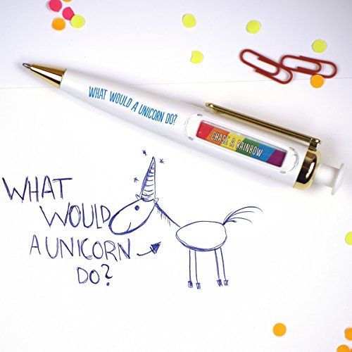 Details: Product Description If you need to restore your faith in magic our What Would A Unicorn Do pen is here to help. Just click to discover what rainbow-fueled activity a unicorn would get up to and do the same. Quality black ballpoint pen in white plastic with rainbow window, gold coloured nib and pocket clip. Box Contains 1 x BallPoint Pen