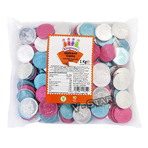 Details: Product Description These are solid milk chocolate coins in Silver, Pink and Blue foils with Unicorns on. They are approx 35mm in diameter. Make great Party Bag Fillers or even Wedding Favours. Approx 140 coins per bag. Ingredients Sugar, whole MILK powder, cocoa mass, cocoa butter, whey powder (MILK), emulsifier (SOYA lecithin), flavouring. Milk chocolate contains cocoa solids 28% minimum, milk solids 16% minimum. Directions Not Applicable Safety Warning Not applicable Manufacturer Contact Information Kingsway Consumer Services