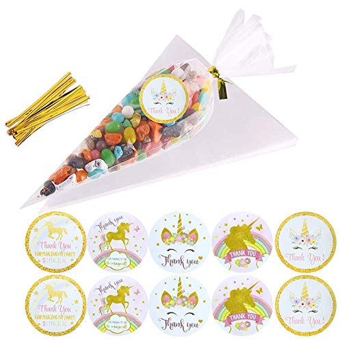 - PACKAGE: Include 40 pieces unicorn gift stickers in 5 disign unicorn and print wuth Thank You. 50PCS cone bag with gold ties,perfect match for party favor ,candy ect.