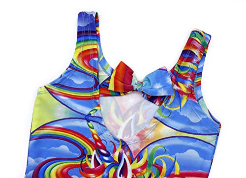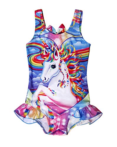 - Girls adorable one piece unicorn swimsuit with vivid rainbows and clouds patterns;