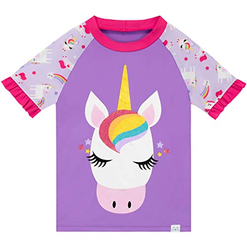 Details: Add some magic to summer trips at the pool or beach with this adorable unicorn motif swim set! Designed by Harry Bear, this lovely lilac swimming costume is comprised of a purple top printed with a beautiful unicorn face and shimmering glitter. Comfy shorts with an all over print of unicorns, rainbows and stars complete the set. Bright pink ruffles to the cuffs and collar add a colourful finish to the swimwear. This unique unicorn swimsuit is sure to brighten up their swimming trips!