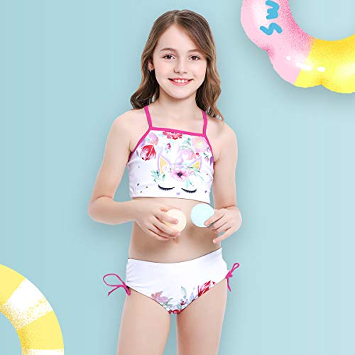 - ❥Style: Girls tankini swimsuit 2pcs bikini set, super cute kids girls bathing suit swimwear halter top and bottom swimsuit. Designed with chic flowers and unicorn pattern, lovely and pretty. Strappy racer back, swim bottoms with adjustable straps details on side. You can dress it up with a hat and a pair of sunglasses, matching a pair of sandals or slippers, make your girl the most shiny princess on the beach.