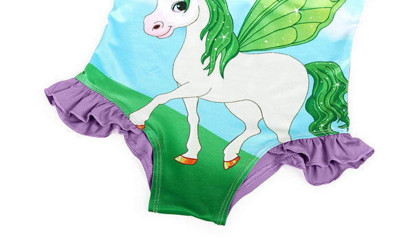 - One piece swimsuit, wide ruffle shoulder straps, unicorns printed, triangle briefs with ruffle trimming, offer a flattering look;