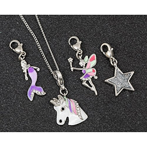 Details: Mystical Design 279285 Silver plated necklace with 4 interchangable charms Unicorn, Mermaid, Star & Fairy Length of chain approx. 34cm - 37cm Comes in a equilibrium gift box Great gift for any occasion