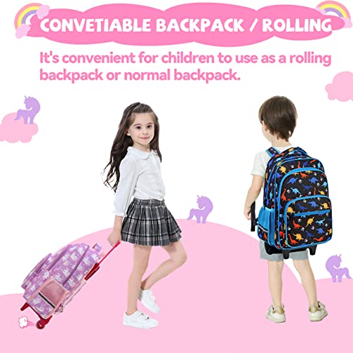 - 💜EASY TO ORGANIZE:The kids wheeled school backpack features easy to open and close zippers, a main zippered pocket,two zippered pockets in front with pen sleeves,separate sleeve interior for laptop/folder/books, two side pockets for water and milk, top loops for storage and other carrying options. Smooth zippers are for the children to open and close easily.It is spacious enough for the students daily usage to keep full sized folders,Chromebook and school supplies,lunch box, water bottle.