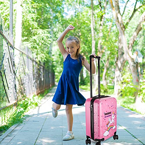 Details: Features: Chic design: Lovely unicorn is popular among kids. The cute appearance can attract your kids to pack their luggage by themselves. They will be willing to participate in and enjoy the process, which can also exercise their independence. And the durable multi-directional wheels which support 360-degree scrolling, making it easy for kids to move. Besides, telescopic handle can adjust the height of parents and children, so that children of different heights can easily pull. Wide application: The interior of this luggage is fully lined with multi-use organizational compartments or pockets, making it easy for packing many items. Its lightweight design makes the luggage will not be a burden for children when they go to school or travel. Specification Color: As Picture Shown The size of suitcase: 18 x 11.5 x 8 inch/ 45.7 x 29 x 20cm The size of backpack: 13 x 10 x 4.5 inch/33 x 25.4 x 11.43 cm Material: polycarbonate, ABS and Nylon Package Includes: 1 x suitcase with multi-directional wheel 1 x backpack with widened shoulder Warm Notes: Please allow slight deviation due to manual measurement and its irregular shape. Please purchase after confirming the size. Please allow slight color difference due to different monitor. Please note that he backpack may be pressed a little due to transportation,but it will not affect its use.