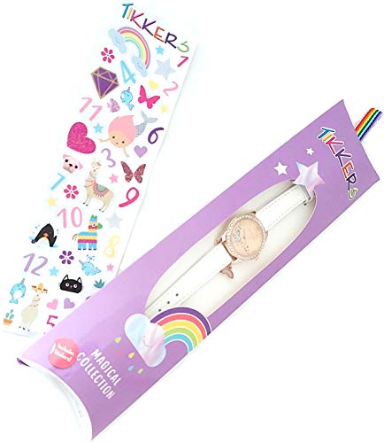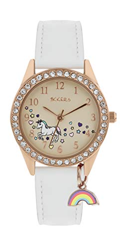 Details: Product Description Tikkers kid's watches are bright, fun and fashionable with a range of styles and features to suit all ages. All Tikkers watches are designed to be practical and comfortable to wear. Telling the time isn't just easy with these watches but also fun! Whether it's the bright colours or the fantastic designs these watches are sure to keep your kids happy. This watch features White PU strap, Rose Gold Alloy Metal Crystal Stones set Case with Unicorn & Heart printed Dial. The watch also has a Rainbow Charm attached to the case. Box Contains Packed in a colourful box with a 1 year guarantee