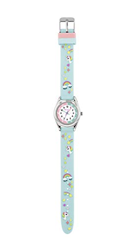 Details: Tikkers time teacher kids watch with silver metal casing, 30mm white dial, 3-hand analogue display, time-teaching feature, unicorn theme, and aqua green silicone strap with traditional buckle fastening.