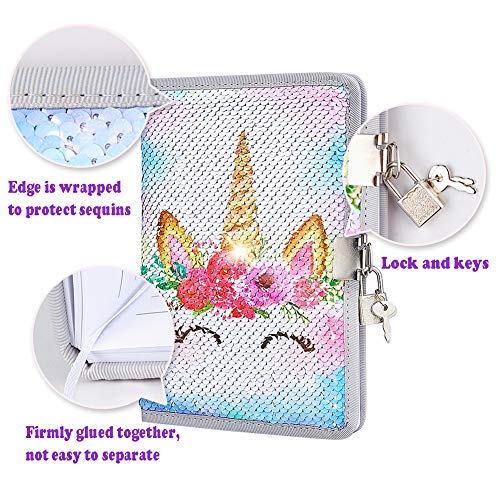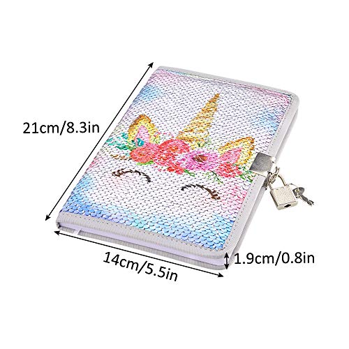 Details: Product Name: Beinou Unicorn Sequin Diary with Lock and Key, Girls Journal Mermaid Sequin Notebook Kids Travel Diary Unicorn Gift for Boys and Girls School Notebook Magic Sequin Journal Features: Reversible Sequins: Enjoy the DIY fun when flipping sequins and turn it into patterns you design. More surprise especially flipping sequins under the sunlight. Neatly Wrapped Edge: Unique design on the market to protect the sequins and make the sequin notebook durable and stylish. Lock & Keys: Record your child’s sweet memory or happy moments in this sequin journal, lock the secret just for your kids. Ideal Gifts: Lovely Unicorn Patterns gifts for friend's or Children's birthday, brilliant notebooks for little girls or your niece who are going to schools. Multiple Uses: For School Use as Travel notebook, diary notebook, homework notebook, secrets notebook and etc. For Office Use as Draft notebook, scratch pad notebook, diary notebook, meeting record notebook, sign name notebook and etc. Specification: Package Included: 1 x sequin journal; 1 x lock; 2 x keys Dimension: 8.3 in x 5.5 in x 0.8 in (L*W*H) Total Paper Sheets: 78 Line Per Page: 22 Customer Service: We are always responsible for the product ordered in our store, please contact us if you have any questions or problems with our products.