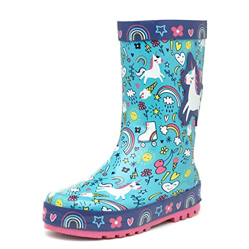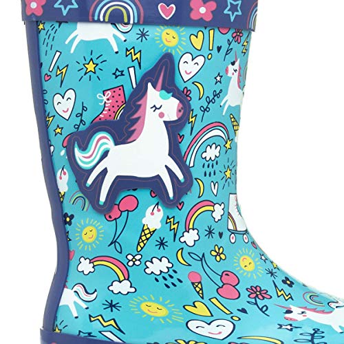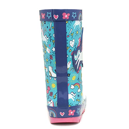 Details: Add a splash of fun to their welly collection with these kids unicorn wellies. They embrace a blue upper along with cute and quirky doodles, as well as a larger unicorn on the exterior for added decoration. Their gripped sole and waterproof construction makes them a perfect choice for splashing in puddles on those rainy days. Designed with comfort in mind, they additionally feature a lined interior and round toe front for a spacious fit. For up to 1 years old we would recommend infant size 3-4, 2 year olds a size 5-6, 3 year olds a size 7-8, 4 year olds a size 9-10, 5 year olds a size 10-11, 6 year olds a size 11-12, 7 year olds a size 12-13, 8 or 9 year olds a size 1-2 and 10-11 year olds a junior size 3-4.