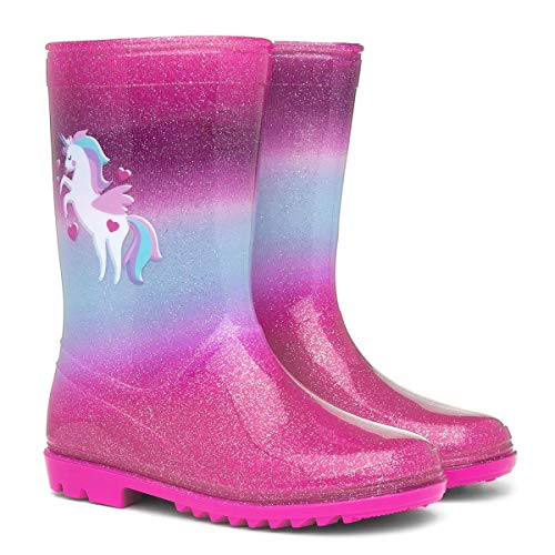 Details: Is your little one Unicorn obsessed? Us too! These kids’ wellington boots are perfect for those rainy days splashing in the puddles. They showcase both a pink and blue glittery ombré upper along with a unicorn printed on the side. Their thick grip sole helps to offer added support and comfort beneath your little ones feet. For up to 1 years old we would recommend infant size 3-4, 2 year olds a size 5-6, 3 year olds a size 7-8, 4 year olds a size 9-10, 5 year olds a size 10-11, 6 year olds a size 11-12, 7 year olds a size 12-13, 8 or 9 year olds a size 1-2 and 10-11 year olds a junior size 3-4.
